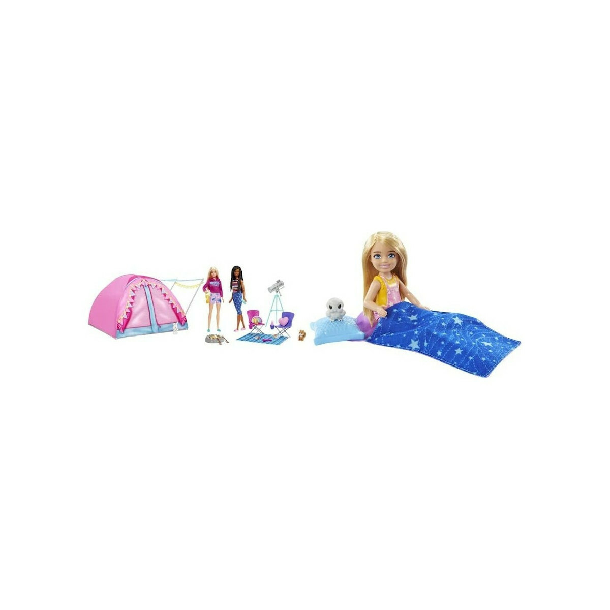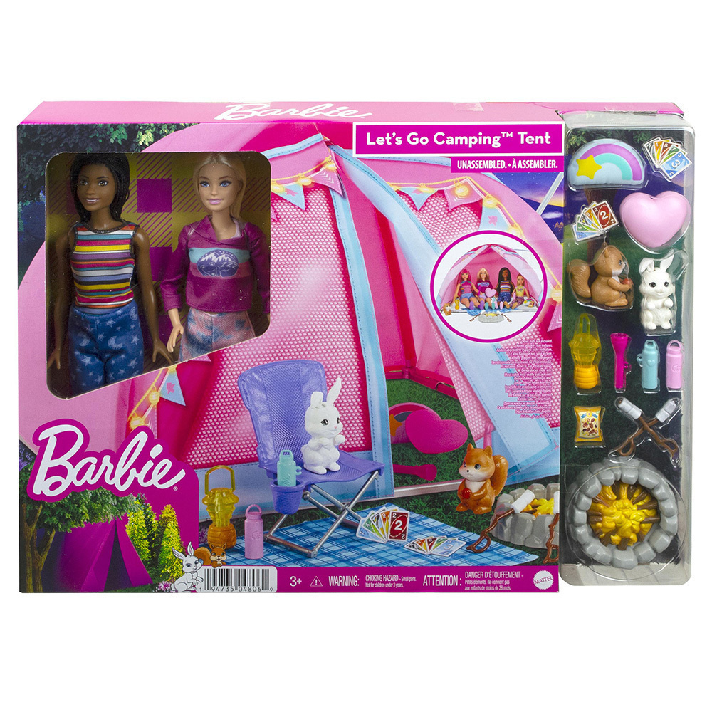 Η πολύ μεγάλη, υφασμάτινη σκηνή κάμπινγκ έχει τέντα διακοσμημένη με φωτάκια και χώρο για τέσσερις κούκλες. Τα παιδιά μπορούν να στήσουν το σκηνικό και, στη συνέχεια, να φτιάξουν ιστορίες με νυχτερινές κατασκηνώσεις κάτω από τα αστέρια, με πτυσσόμενες καρέκλες, τηλεσκόπιο, φωτιά, ζαχαρωτά, ένα παιχνίδι με κάρτες και πολλά άλλα αξεσουάρ.