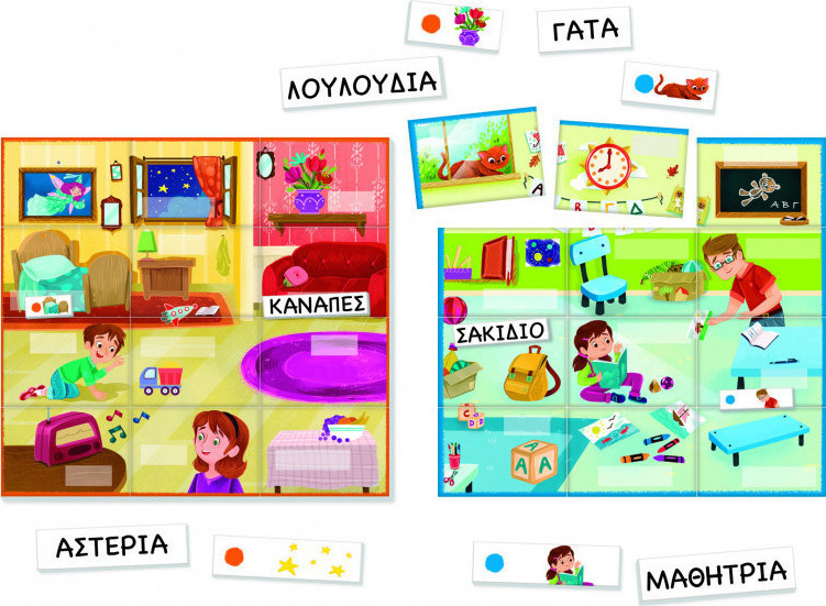 Εκπαιδευτικό παιχνίδι με 12 εικονογραφημένες καρτέλες και 24 κάρτες λέξεων για να μάθει το παιδί τις πρώτες του λέξεις με διασκεδαστικό τρόπο!