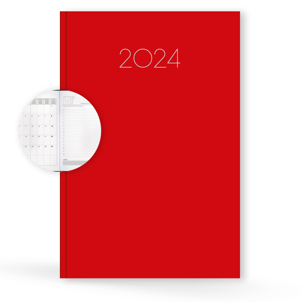 Ημερήσια ατζέντα του 2024, σε κόκκινο χρώμα. Διαθέτει ξεχωριστές εγγραφές ανά ημέρα για τον προγραμματισμό των καθημερινών σας υποχρεώσεων, όπως για παράδειγμα, ραντεβού, γενέθλια και προθεσμίες.