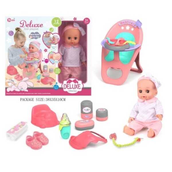 Κούκλα μωρό, με 12 ήχους, που κάνει πιπί. Το σετ περιλαμβάνει ακόμη καρεκλάκι και αξεσουάρ ταΐσματος, γιογιό, παπουτσάκια και πιπίλα. Λειτουργεί με 3 μπαταρίες AG13 (περιέχονται).