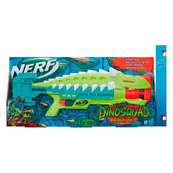 Συνεργαστείτε με θρυλικούς δεινόσαυρους ως μέλος της ελίτ DinoSquad! Εκμεταλλευτείτε την εκπληκτική δύναμη των μεγαλύτερων δεινοσαύρων όλων και ξεκινήστε εκπληκτικές περιπέτειες! To Nerf DinoSquad Armorstrike, διαθέτει εκπληκτικό σχέδιο δεινοσαύρων, αιχμαλωτίζοντας την εμφάνιση ενός δεινοσαύρου Anklyosaurus. Εκτοξεύστε 8 βελάκια στη σειρά, για να δείξετε στους στόχους σας ότι έχετε άφθονη δύναμη dino! Αντλήστε τη λαβή πτώσης για να προετοιμάσετε τον εκτοξευτήρα και επωφεληθείτε από τη σχεδίασή του, για να σταθεροποιήσετε τον στόχο σας. Ο εκτοξευτής περιλαμβάνει 16 Επίσημα βελάκια αφρού Nerf Elite — 8 βελάκια για τη φόρτωση του τυμπάνου και 8 βελάκια για επαναφόρτωση. Και μπορείτε να κρατήσετε αυτά τα 8 εφεδρικά βελάκια κοντά, επειδή το blaster διαθέτει ενσωματωμένο χώρο αποθήκευσης βελών. Για να παίξετε, φορτώστε το τύμπανο, μετακινήστε τη λαβή πτώσης προς τα πίσω και προς τα εμπρός για να προετοιμάσετε τον εκτοξευτή. Συνιστώνται γυαλιά (δεν περιλαμβάνονται). Δεν απαιτούνται μπαταρίες.