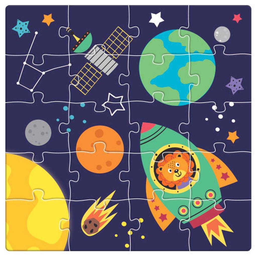 – Περιλαμβάνει 3 παζλ 20 τμχ. το καθένα που απεικονίζουν πλανήτες και όχι μόνο και μια μαγνητική επιφάνεια που διπλώνει.