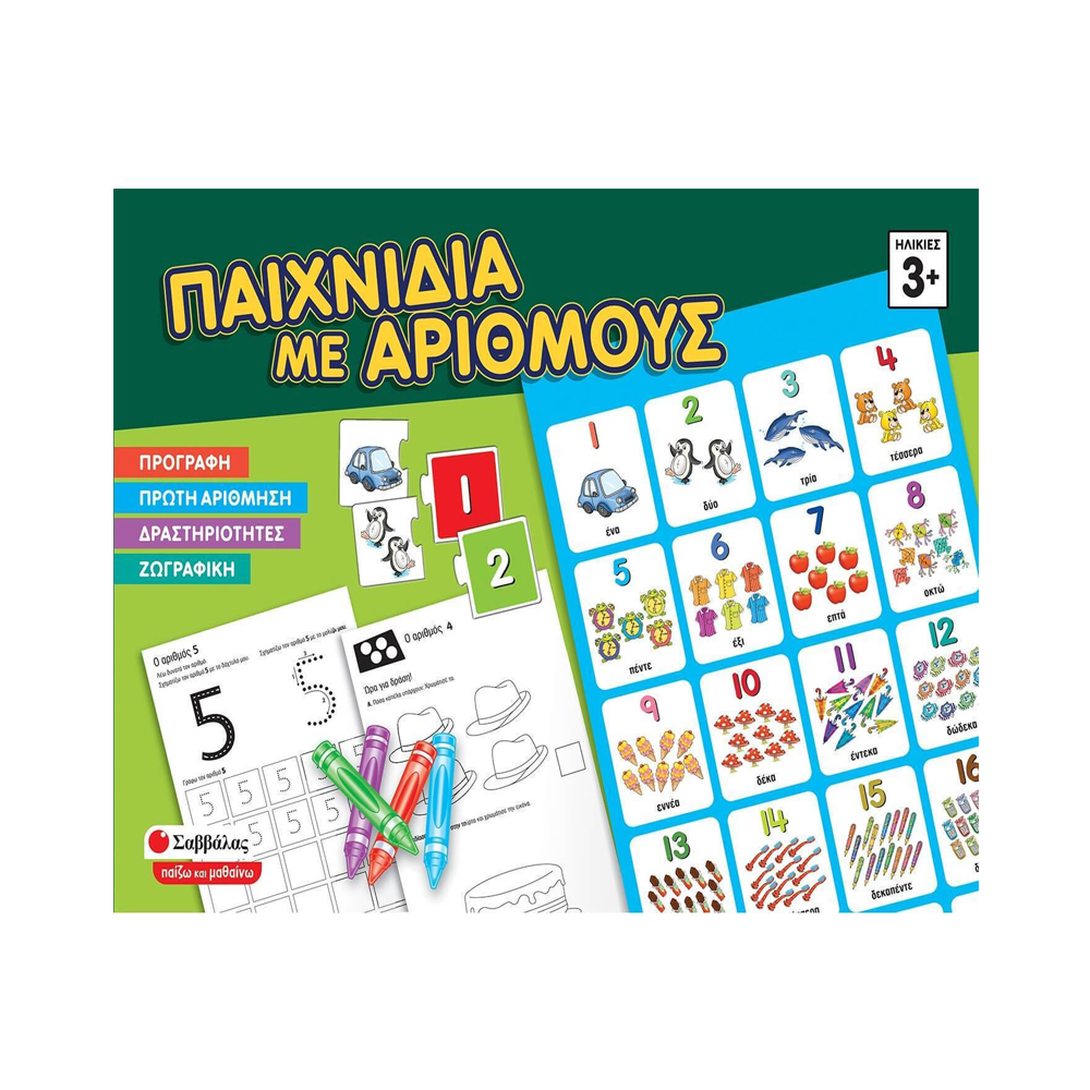 Ένα πλήρες πακέτο με καρτέλες, αφίσες, κηρομπογιές και μολύβι για ατέλειωτες ώρες δημιουργικής απασχόλησης με ζωγραφική και δραστηριότητες προγραφής και πρώτης αρίθμησης.