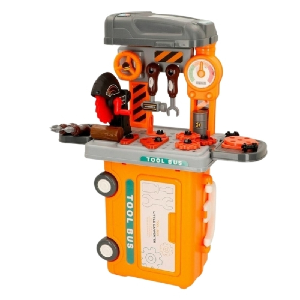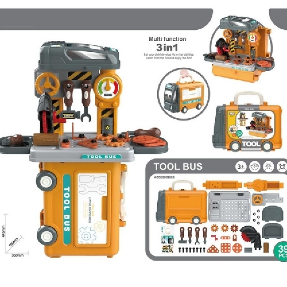 Παιδικός πάγκος εργασίας με κατσαβίδι, σφυρί, κλειδιά και πολλά αξεσουάρ, που μετατρέπεται σε τραπεζάκι ή βαλιτσάκι για εύκολη αποθήκευση και μεταφορά. Το παιχνίδι έχει διαστάσεις 45x16x35cm και αποτελείται από 39τμχ. Προσοχή! Δεν είναι κατάλληλο για παιδιά κάτω των 3 ετών, μικρά μέρη – κίνδυνος πνιγμού.